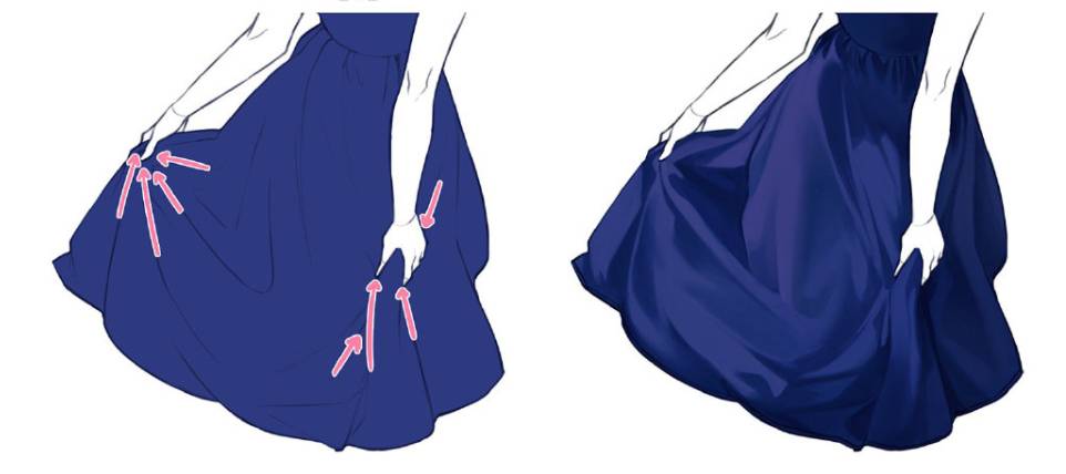 提着裙子的时候,越靠近施力点,裙子越平整,衣褶也越浅。远离施力点,越往中心处的衣褶,则会越深、越密。