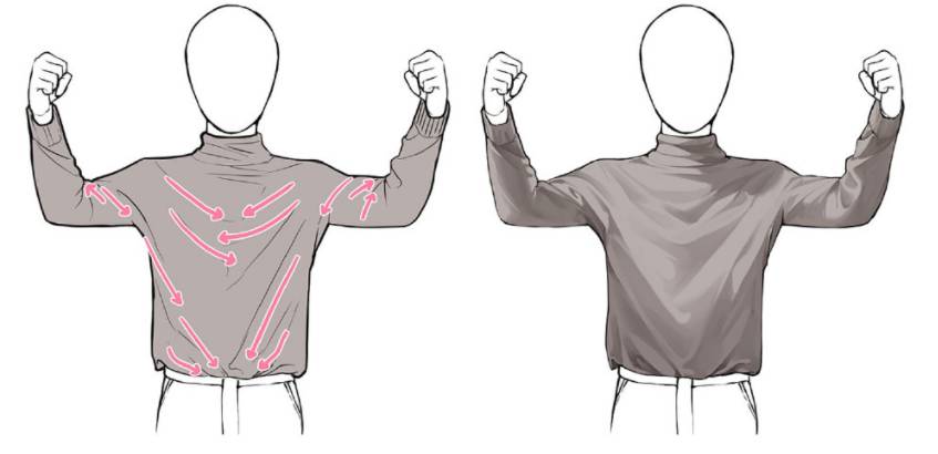 举起手臂的状态下,衣褶会朝向腋窝产生。靠近腋窝处的褶皱会更深、更暗。