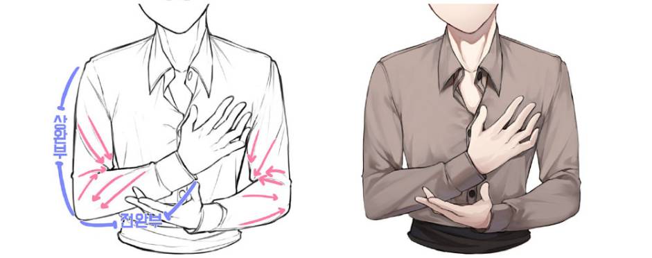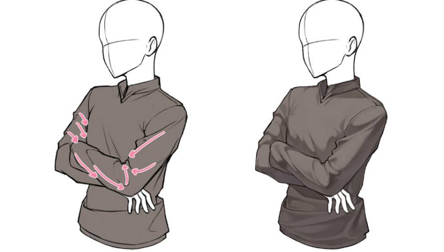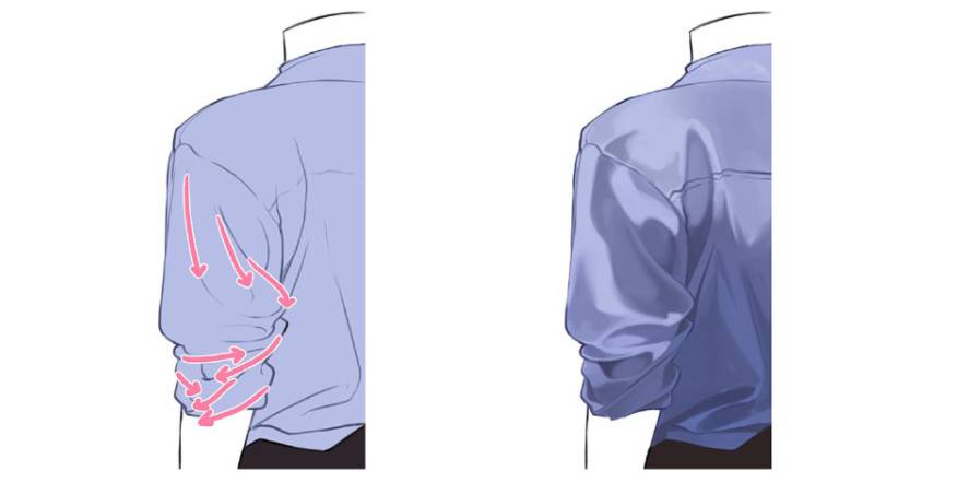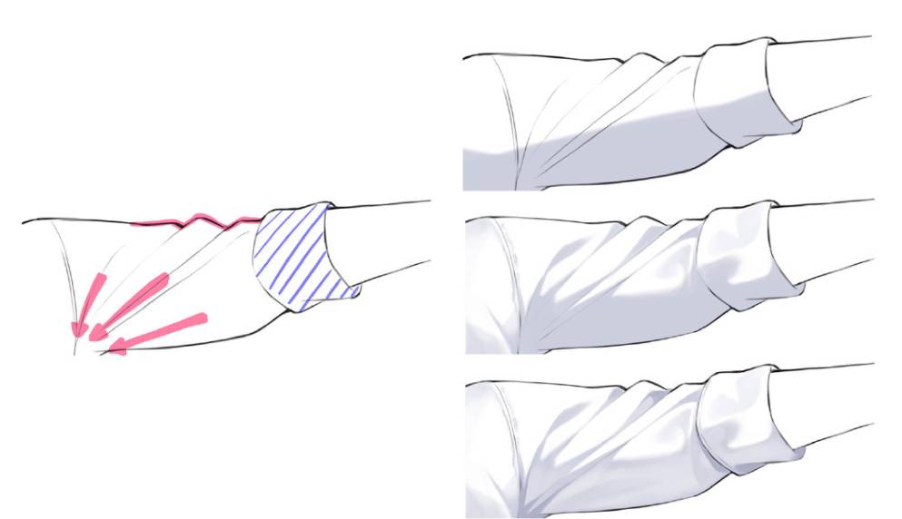 手臂弯曲时,以关节为划分,上臂产生的衣褶,向关节内侧产生。前臂的衣褶则有一个向外的,绕过关节外侧的趋势。