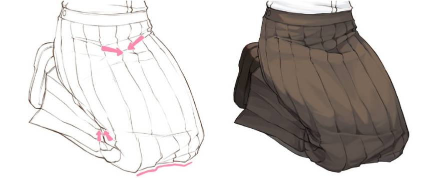 这个姿势下,衣服的褶皱主要集中在胯部和膝盖处,即使是膝盖并拢的状态,两条大腿中间也应该绘制凹陷的轮廓,这样看起来才比较自然。