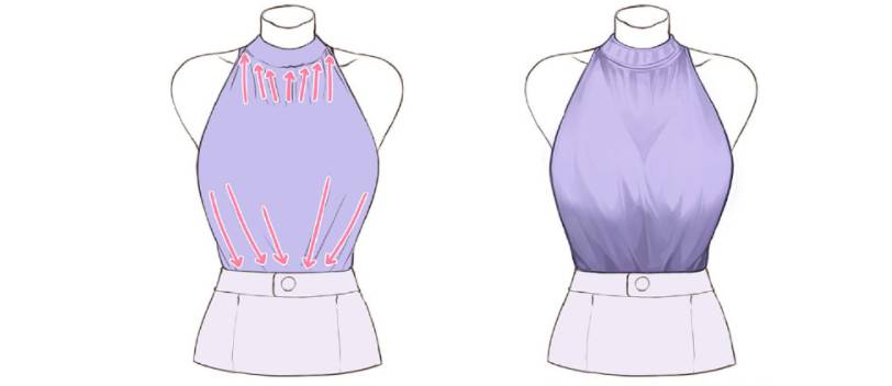 无袖衣服的褶皱集中在颈部和腰部,特别是脖子周围,那里的褶皱会更加密集。
