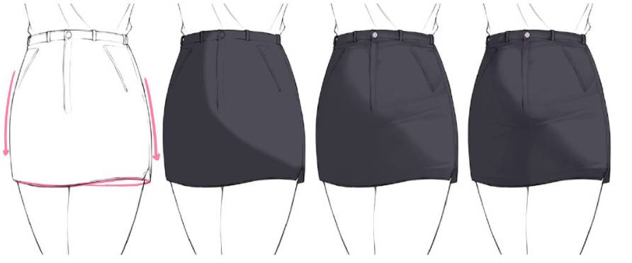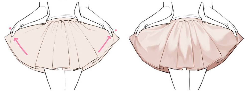 绘画裙角时,被大腿挡住的部分也要画出来。因为没有能产生较大褶皱的因素,所以整体的褶皱是比较浅而宽的。