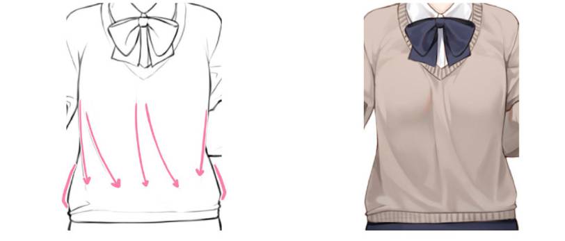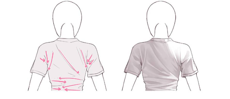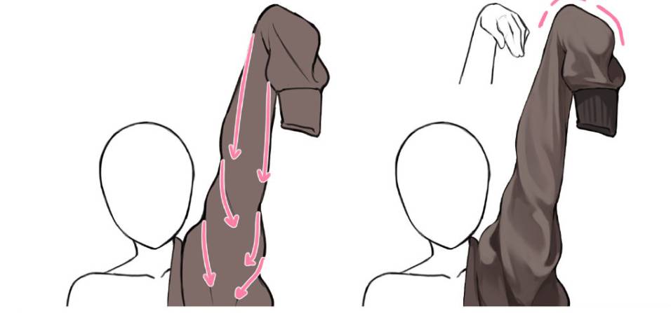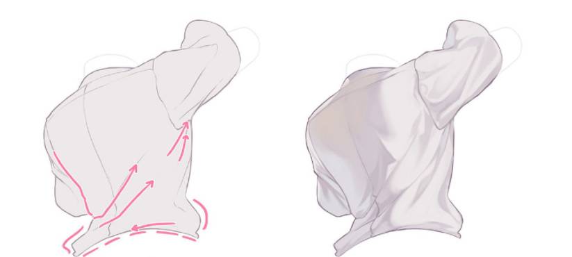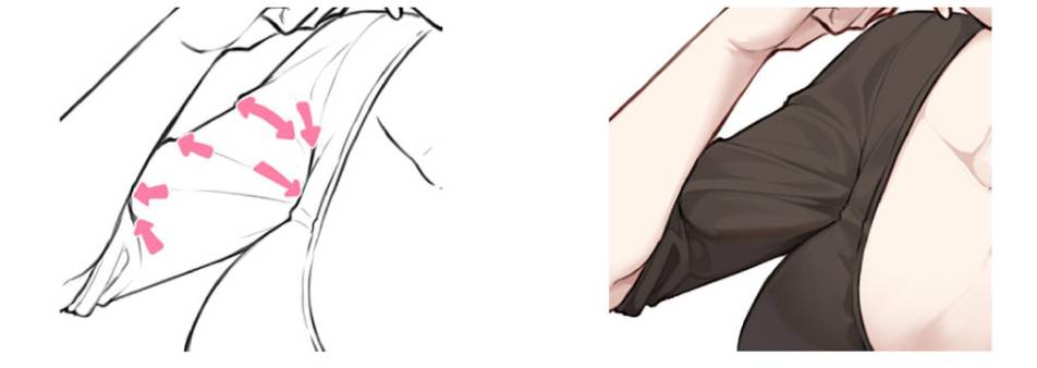手臂产生的衣褶会朝向腋下,由于衣物是紧身的,所以会产生左右拉紧的衣服褶皱。