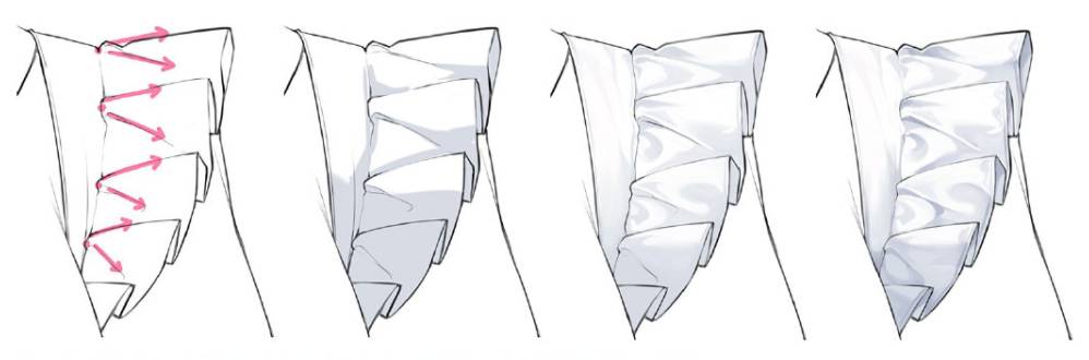 褶边从起点开始逐渐变宽。起点处的衣褶较深、清晰,越往后就越宽,形成一个变化。