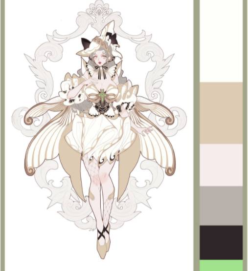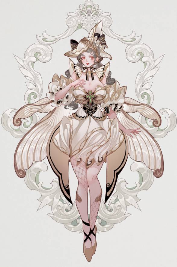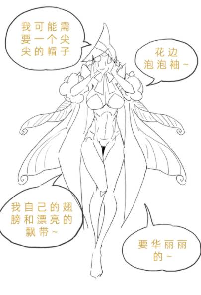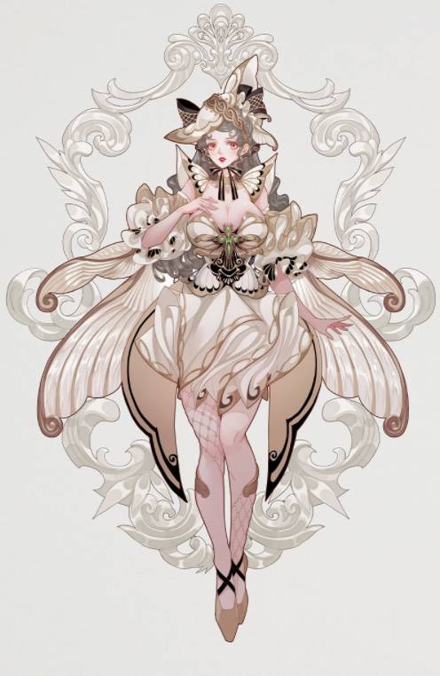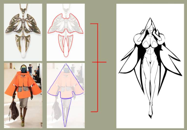 这里我主要结合的是这两张参考,一个首饰,一个时装既带有昆虫的轮廓特征,又不完全是昆虫的样子,产生了一定的形变。将这两个轮廓结合起来就大致出现了一个人形,下面就简单粗暴的把人物塞进这个轮廓里就好咯~