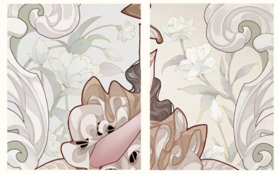 这个时候如果觉得画面单调就可以搭配些花花草草的在人物后面,但是注意对比度一定要低,小图看起来完全可以融入背景的这种暗纹的感觉,人物的头部周围一定要留出透气的空间来哦,不要干扰到头部的轮廓。