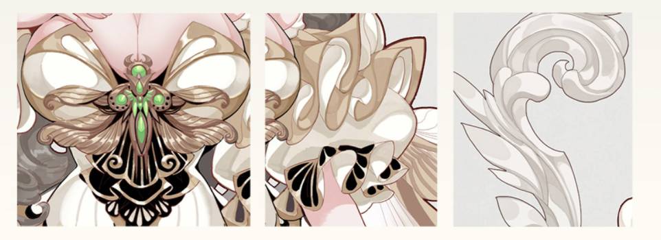 配色思路上整体是比较简单的,由于是偏欧式的华丽风格色调上不要花里胡哨,可以主要采用虫虫身上的暖白与金色搭配,再用少量的暗色与高饱和的绿色来添加重点区域的层次。