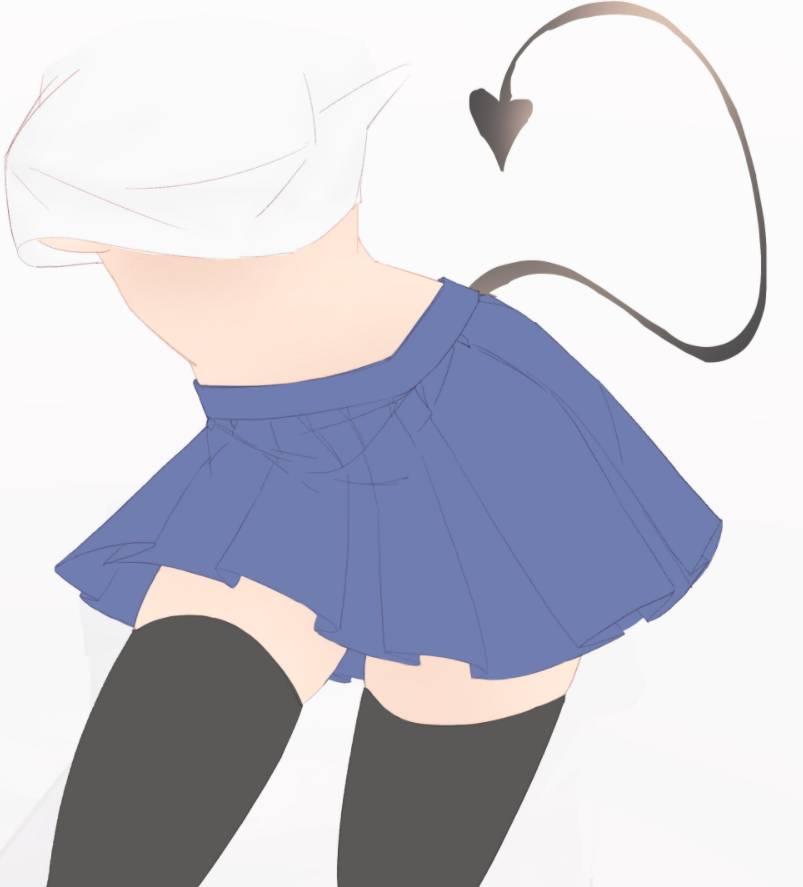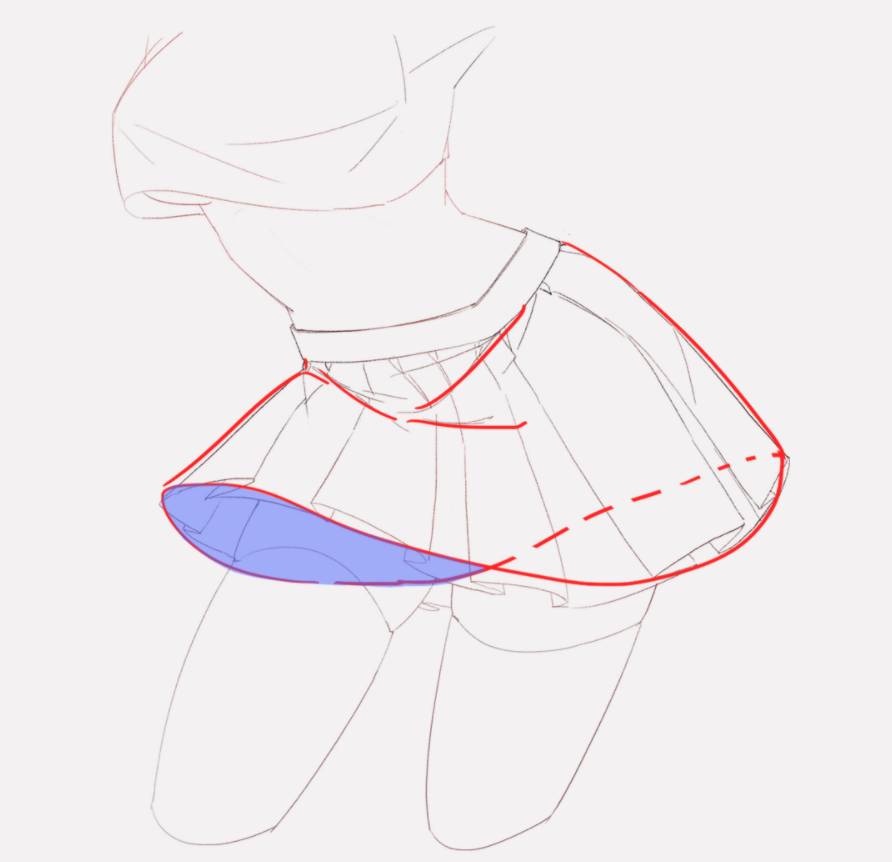 可以把jk水手服短裙看成一个梯形,然后飘动起来就会有一些透视,一般可以做成一个S型曲线。注意翻折的前后面,裙子一开始不用做太多褶皱,画出最关键的位置就可以啦~