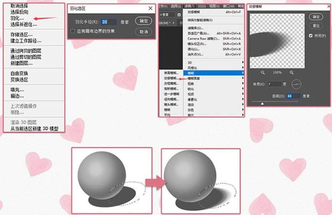 首先运用选区工具,将投影的后半段完全选中,然后右键羽化值调整为20(这一步要根据你的画面大小做判断,可以自己去尝试一下),然后滤镜—模糊—动感模糊,拉动轴选择一个比较合适的数值。