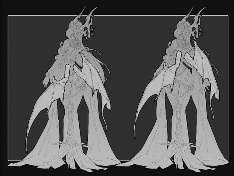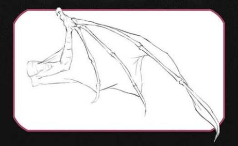 这次我们要绘制的是龙翼,翅膀的大小样式虽然有很多,但就像我们前面说的一样,都是三段式的骨架结构。所以绘制时首先我们要用线稿确定大致的比例和动态,要注意“手指”之间的连接要用曲线连接,如果用直线连接会显得很僵硬,很机械缺少生物感。并且翼膜因为是有厚度的,所以在非完全展开的情况下,是会因为折叠产生褶皱的,思路就跟布料或者皮是一个道理哦。
