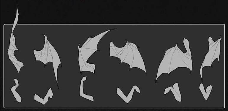 首先是翅膀的结构。大家要知道我们所熟知的恶魔翅膀也好、西方恶龙翅膀也好,其实原型都是现实中的蝙蝠翅膀。所以不管是在结构还是造型上蝙蝠翅膀都是一个非常重要的参考依据。也因为如此所以画这类翅膀时不要凭空想象,以蝙蝠翅膀这个初始造型作为依据进行设计和绘制,会让你的画面更有说服力和合理性。