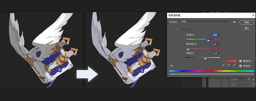 把暗部中浅色的地方用为魔棒工具选中,调整浅色部分的明度和饱和度(快捷键Ct+U),把暗部中的浅色部分稍微调亮一些,这样会更透气一些。