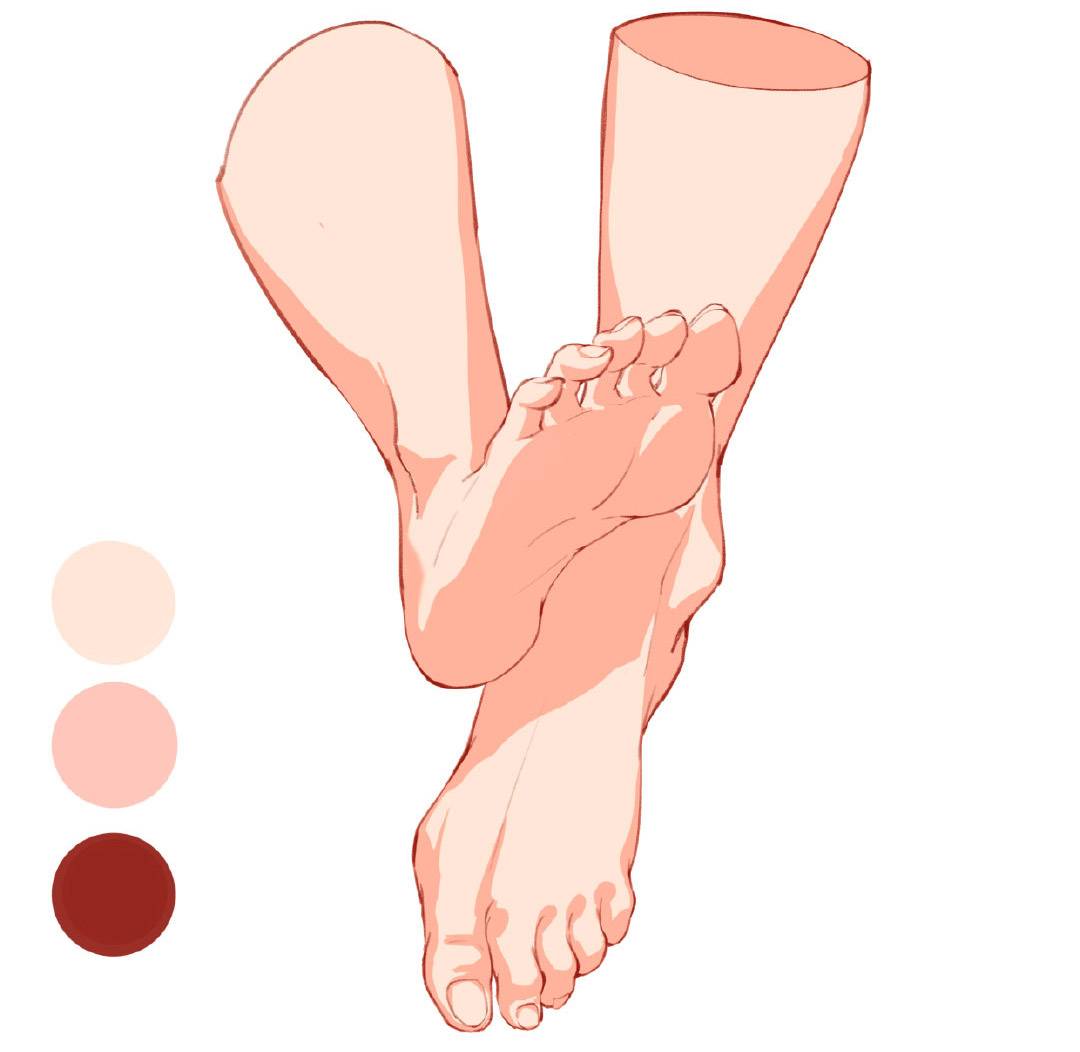 用硬笔平铺完固有色之后,新建一层图层,图层属性选择【正片叠底】颜色选择比肌肤微微偏粉红一些的暖红色,做出大的明暗关系。脚底朝下,可以整体压暗,趾缝之间可以微微有透光。上面的脚会挡住下面的脚,因此也会有投影。四趾朝下的面整体压暗。