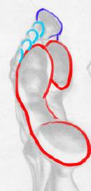 如图所示:脚背的整体趋势呈现一个拱桥的形状,连接脚趾。大拇趾较为粗和直,关节更大。其他四趾呈现环形阶梯状分布,越往外趾头越小。