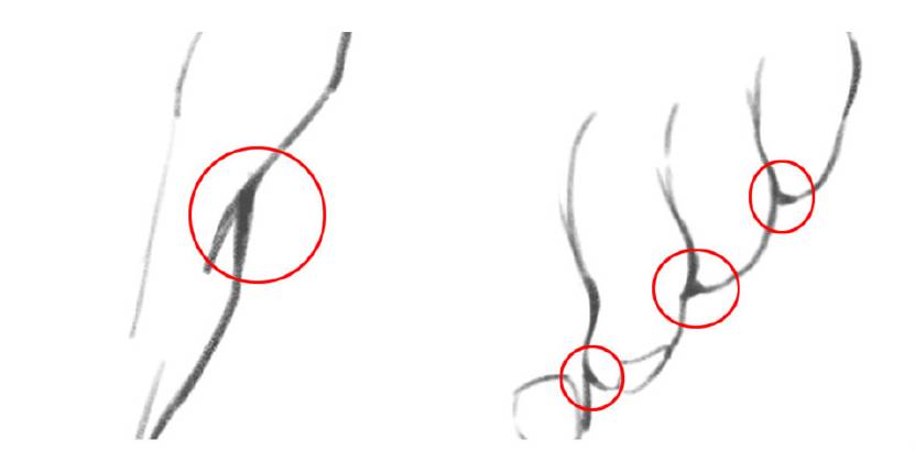 起草稿,根据上述知识点先画出脚部大致的轮廓,注意脚趾的变化曲线,越往外越内收。