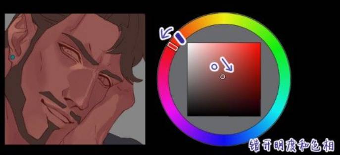 2.1、根据铺色时的基底颜色,选用较深的颜色(参照色轮),粗略地绘制出阴影。使用亮色,根据喜好在合适的位置添画高光。我在眉头的褶痕处添加了高光。