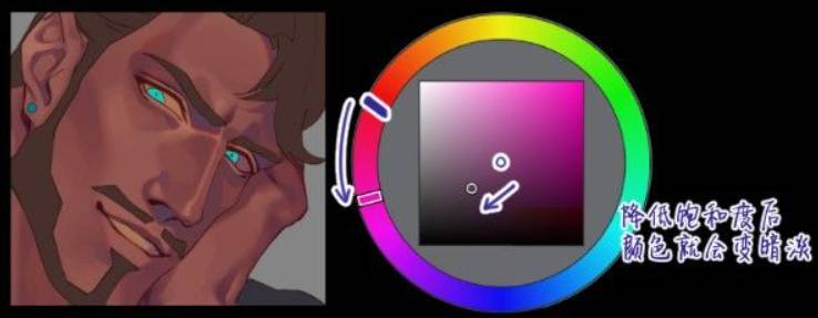 2.4、在深色阴影的内部,选用灰色调的颜色进行上色。(参照色轮)到此脸部的上色基本完成。