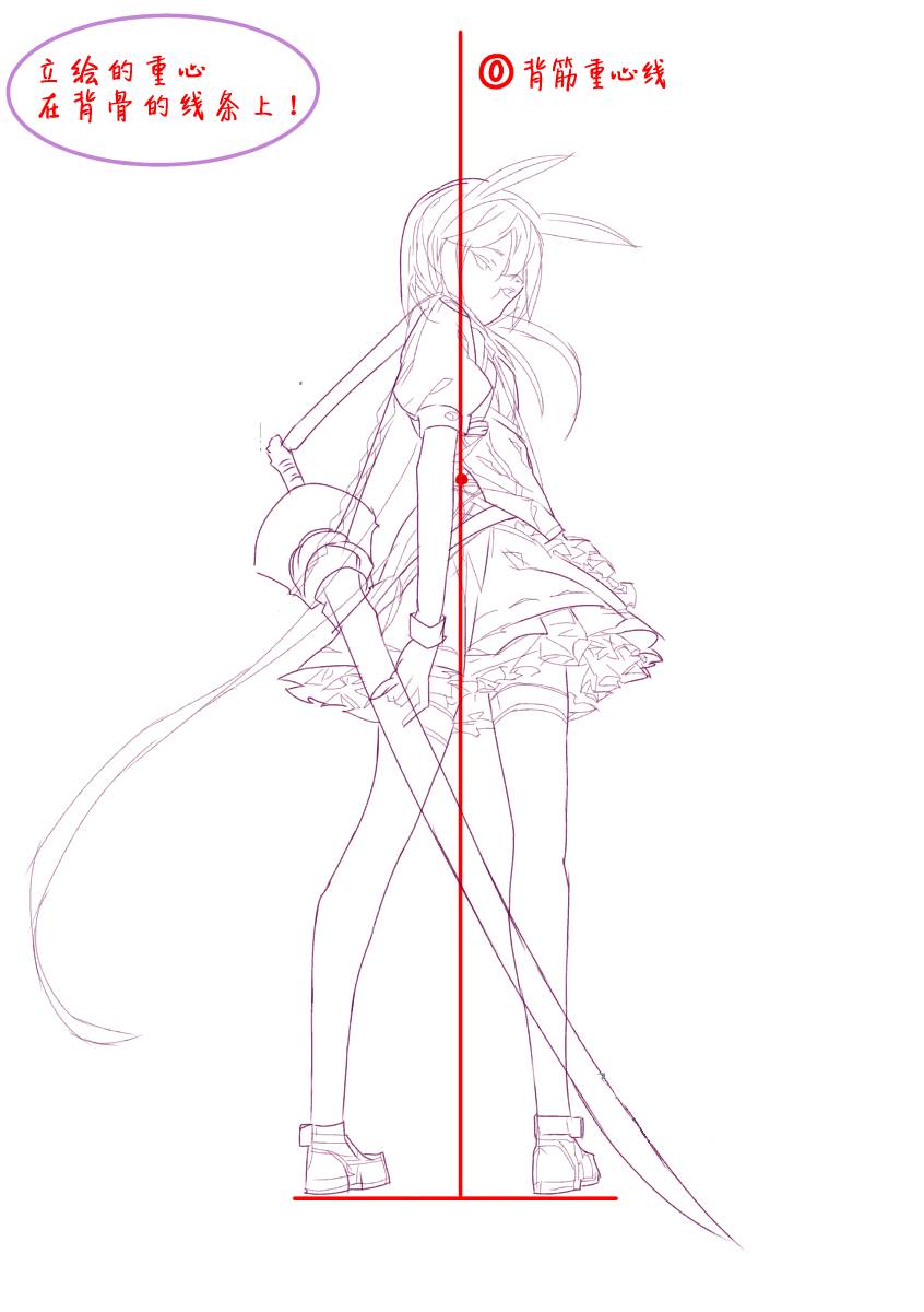第一步、重心线在肚脐上方,不会过有会(头的丁顶点)另一端会交于指尖的连线。这样的话,肩膀就会靠前,看起来像驼背,看不出人体的S型。