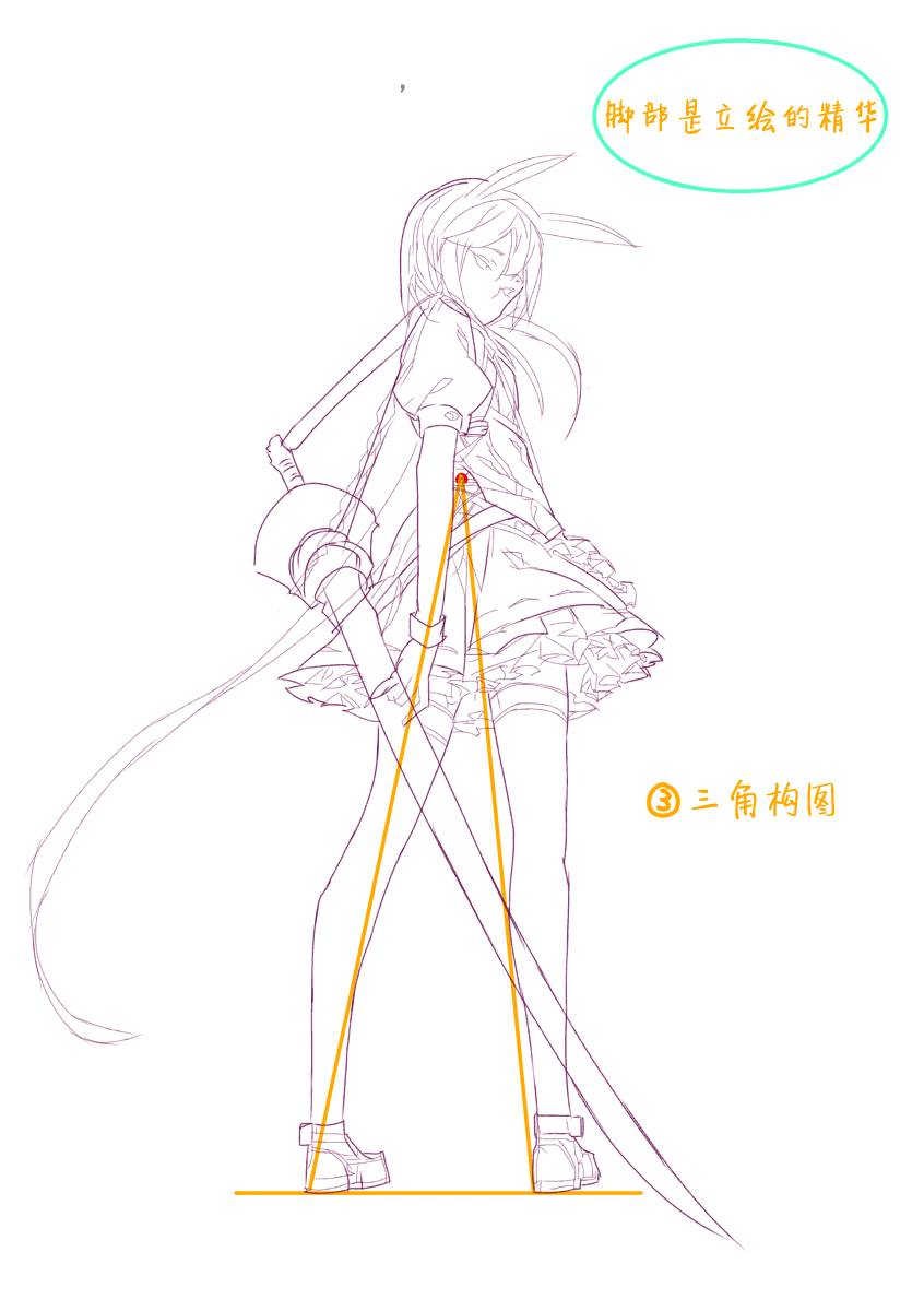 第二步、为了避免出现立绘中常出现的很平淡的画面。可以借助头发、道具等来构建对角线。这时,对角线的交点要放置在和重心稍有错开的位置较为合适。