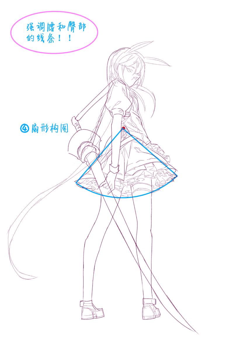 第三步、为了避免画出僵硬的立绘站姿,需要对身体添加一些扭转角度。在决定人物姿势时,先大致画出肩部、腰部、脚部的线条。要表现身体的扭曲时,要注意远近法,向远处延伸的的部分要画得收一些。