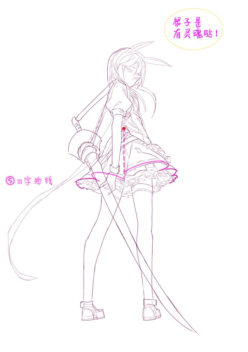 第六步、近处的裙边部分要仔细地作图,可以利用m字曲线的方法来画像连衣裙这样随风飘舞的东西,也可以用这种方法来画。这时,以重心线为界,左右分开绘制m字曲线,并且越到边缘曲线越短,曲线由纵向转为横向。