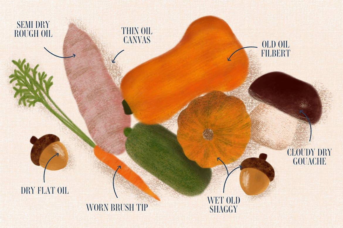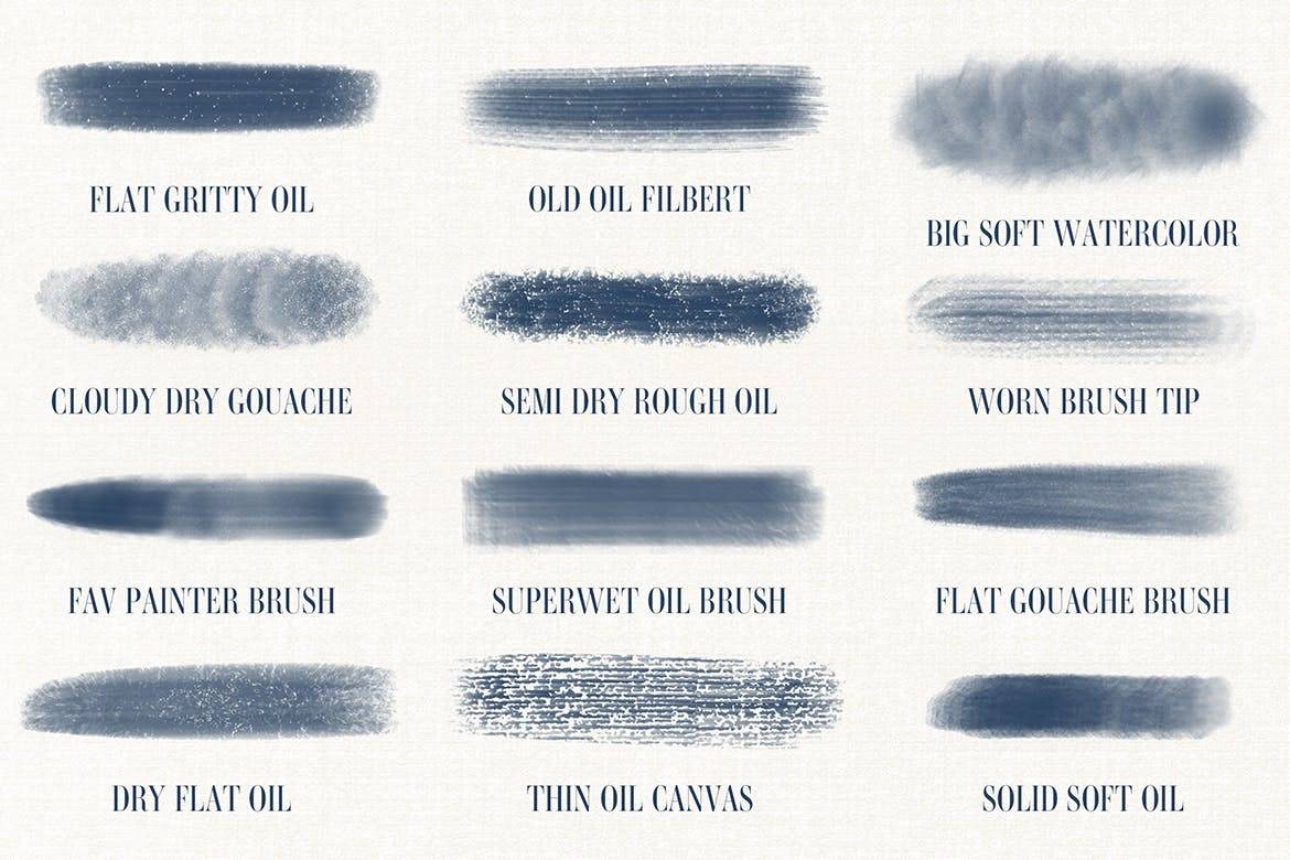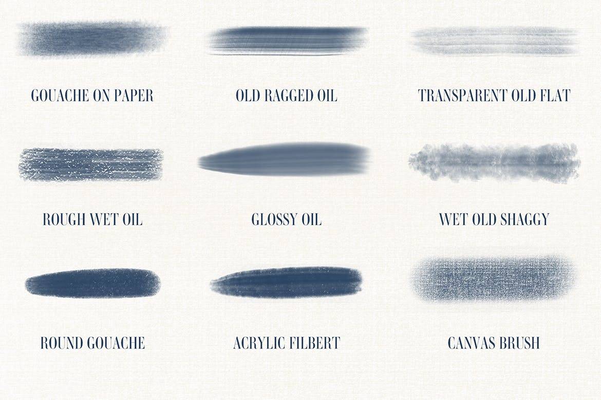 我还做了很多不同质地的油画笔,你可以选择有光泽的油彩,厚实的糊状油彩或有砂砾状油裂的笔刷使用。在这套笔刷系列中,也有各种水粉画笔。它们拥有非常真实的效果,用大的柔软的水彩画笔,你可以画出更大的空间或为你的插画添加云雾状的纹理。21支Procreate画笔,包含油画、水粉画、丙烯画等等。