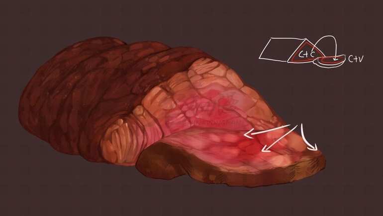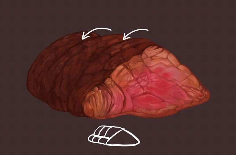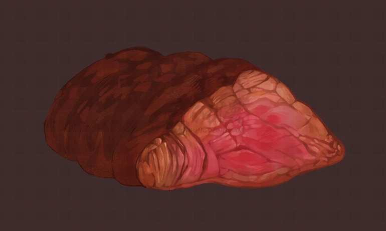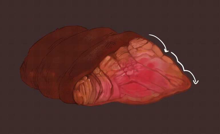 其中熟肉部分因为水分会被吸收,会逐渐产生类似木头一般的纹理构造。而相较之下半生半熟的地方会显得比较软嫩,我们就需要做出这两者的材质区别。