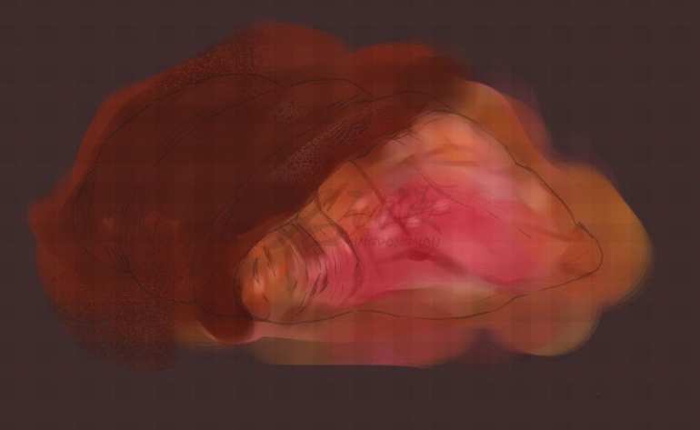根据我们线稿阶段决定下来肉块的纹理走向,开始处理大的明暗变化。如果担心颜色不好掌控的话,可以灵活使用图层效果(线性加深或者色彩增值)来进行微调整。
