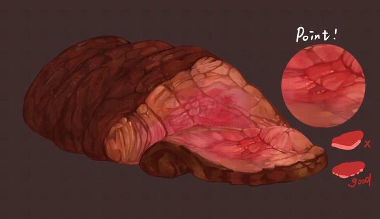 至于牛肉要画几分熟这个由大家自己决定。这张图是五分熟效果,中间使用了粉嫩的玫瑰色,主要是色彩非常好看而且也很美味。