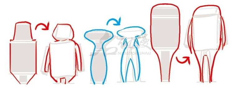 (5)当然无论是现实生活还是漫画中,这样的人都是不存在也不美观的。因此我们需要使用曲线,将这些人体体块连接成更好看的形状。