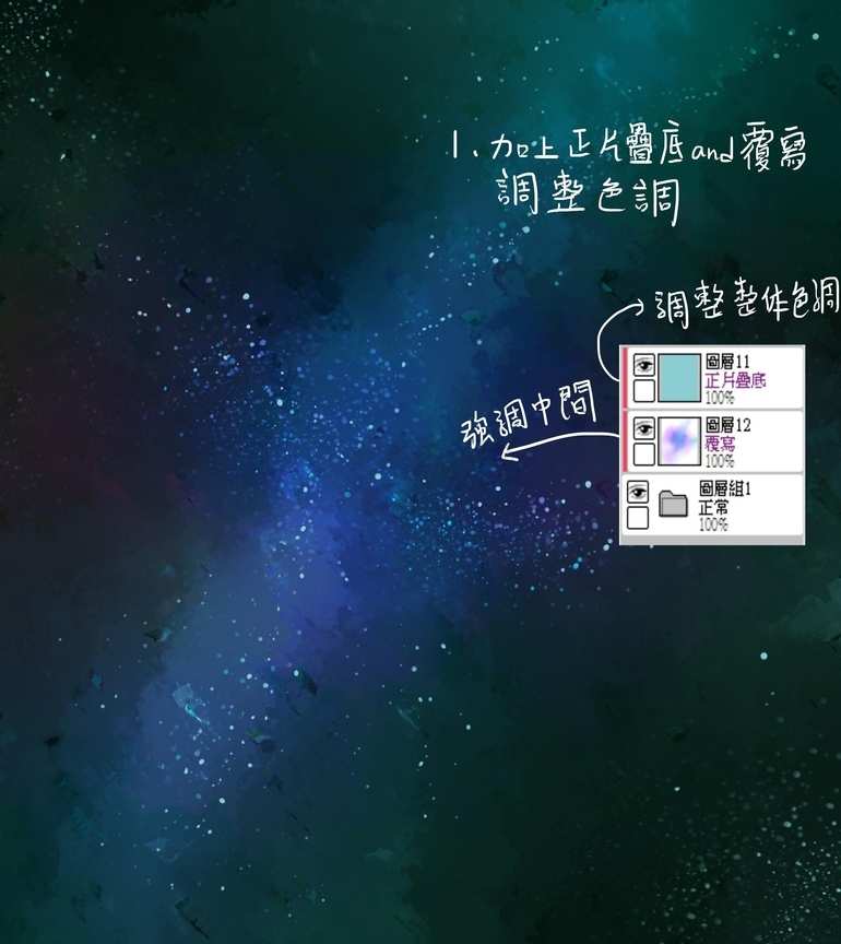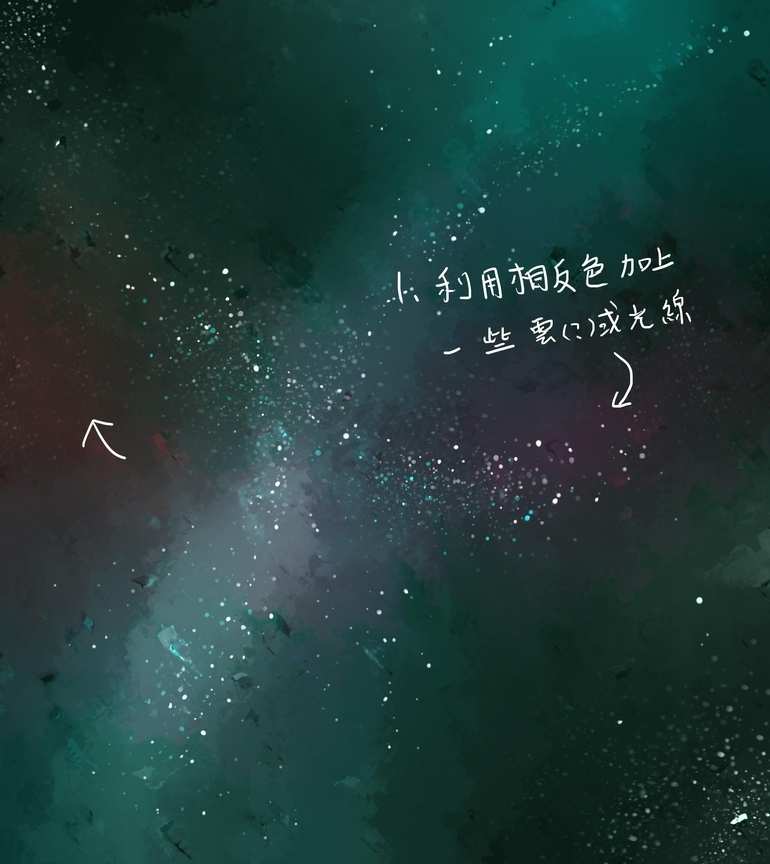 (1)星空和底色不同,它会呈现出冷光效果。因此我们用一个偏蓝的亮色刷在画面中。
