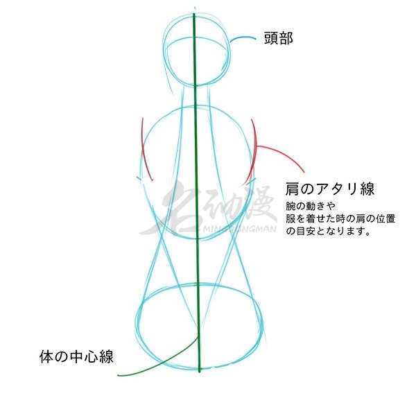 头部是个球体结构,这个很多同学都知道,要画出来。另外后颈部还有两条连线,是直接延伸到骨盆位置的。