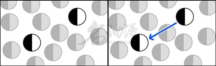 当两个有着同样非常强烈对比和鲜明特征的物品靠近时,即使它周围有其他元素,我们的视线也会本能地忽略它们,并在这两者之间来回移动。