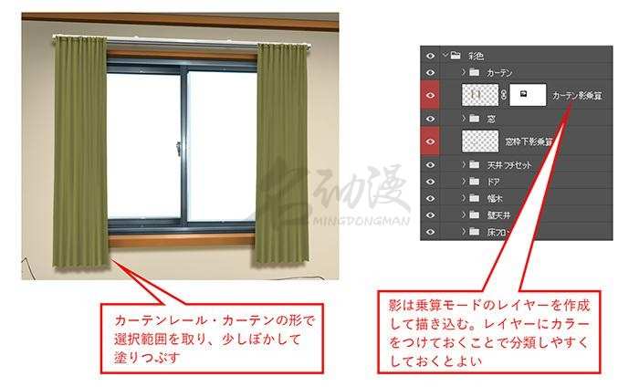 和窗框一样,窗帘也是会产生影子的和窗框不一样的是,窗帘和墙壁之间是有空间的,所以窗帘的阴影边缘要更加模糊一些。