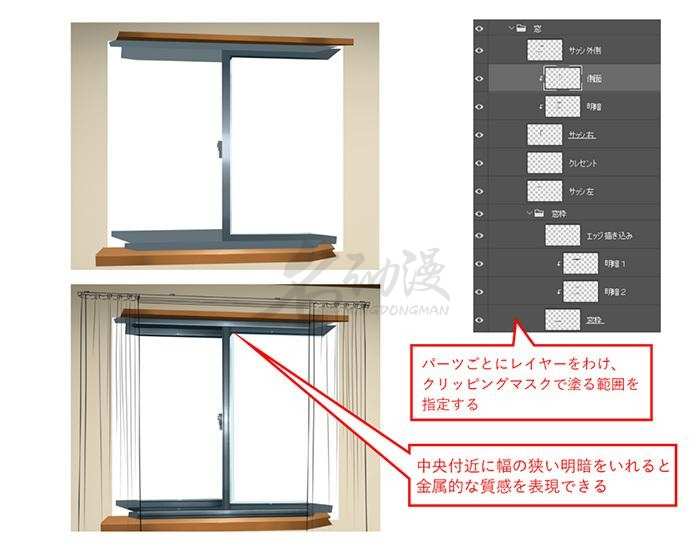 注意我们再给窗框和窗扇上色的时候,需要考虑吊灯的光带给窗框结构的阴影。