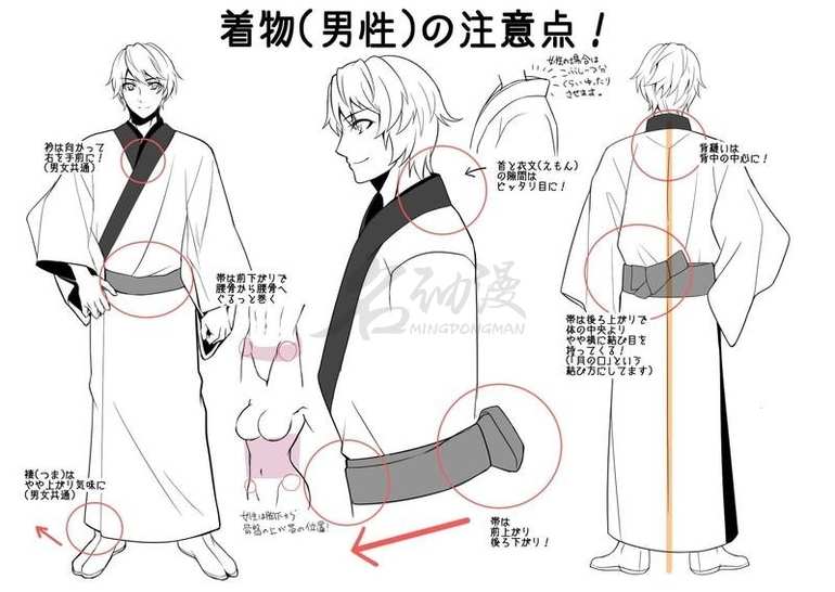 根据人物的性别不同,和服的穿着方式也是大不相同的。腰带和领子部位是重灾区,尤其是脖子后面的部分更是很多同学都画不好的地方。