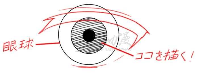 首先要在定好的瞳孔位置上,决定好想要的光源,分好高光处和上眼皮的投影。特别注意瞳孔明暗关系,不能直接一个底色,会没有灵动感的。