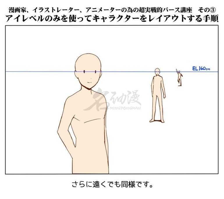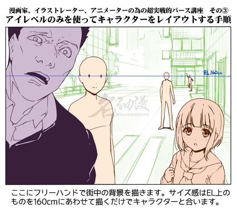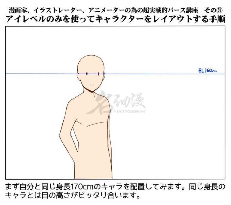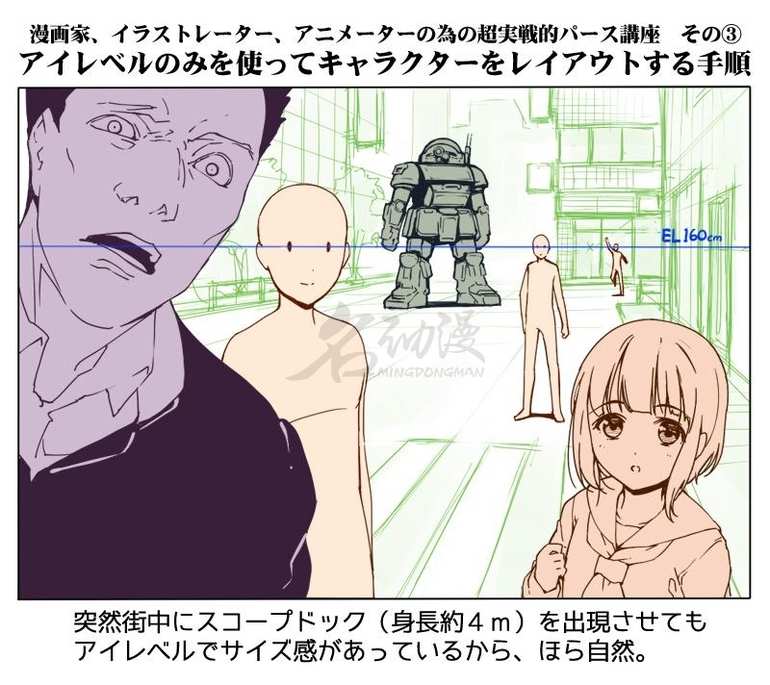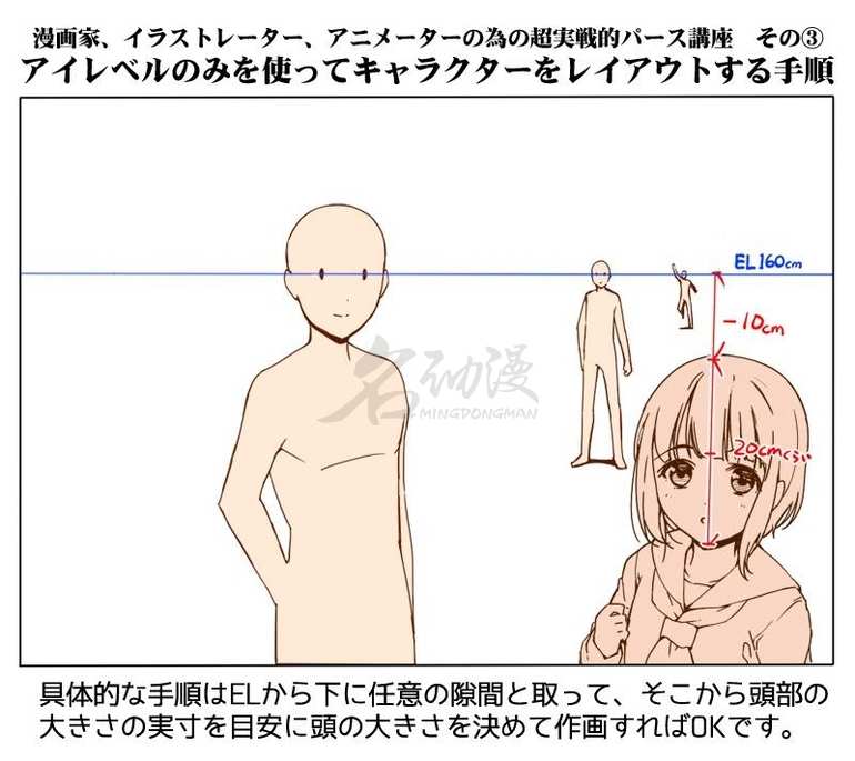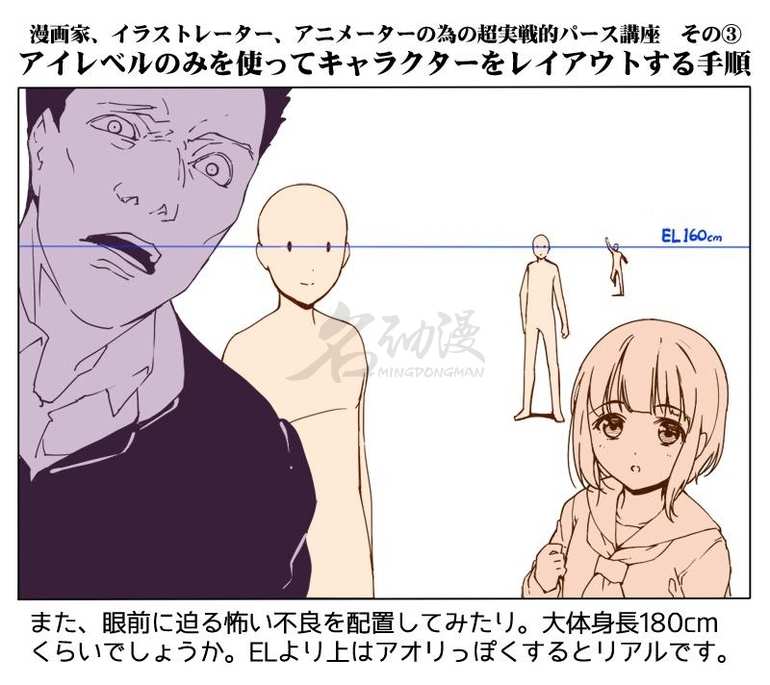 前面我们已经确定视平线高度是160cm,那么这个150的小姑娘全身就是在视平线之下,呈现出俯视的效果。