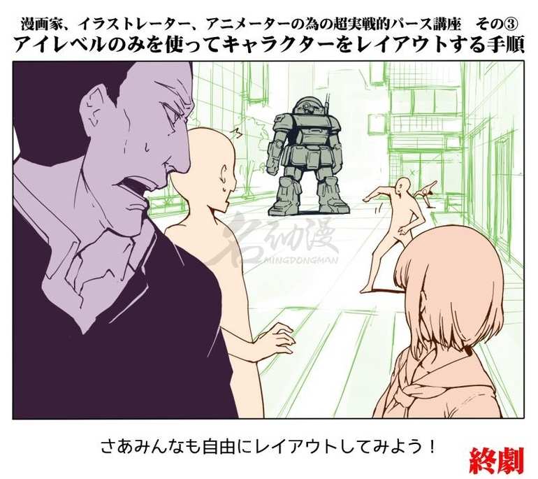 7、如果你想画一些别的物品,依旧需要根据视平线进行绘制。根据我们之前的参考系大概可以推算得出来,下图中添加的机甲高度差不多有4米左右了。