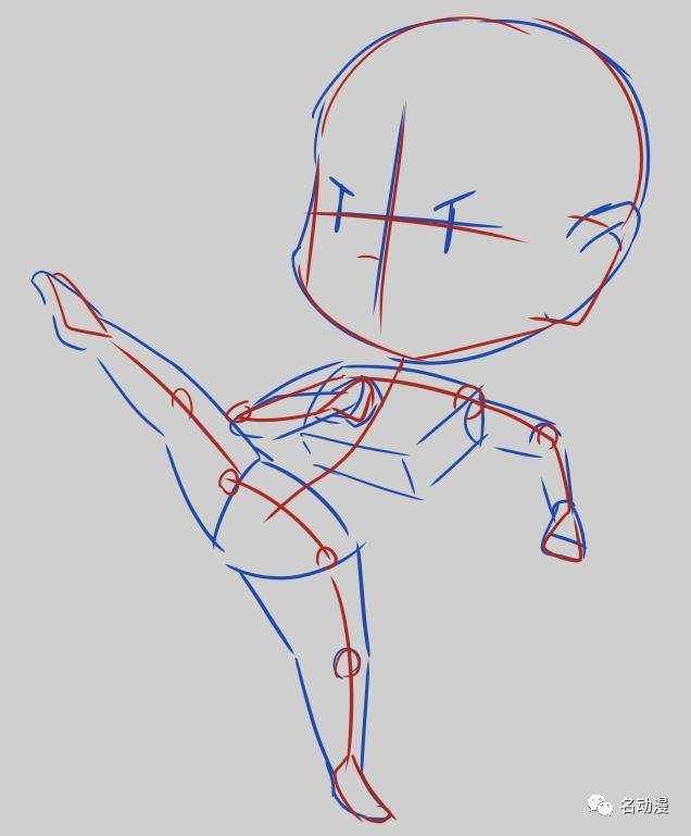 比如Q版人物的特点是大头小身子细腿,那我们就可以“压缩”头以下的结构,再补充一点的就是,大家在概括体块的时候,还需注意人体块面的透视问题。