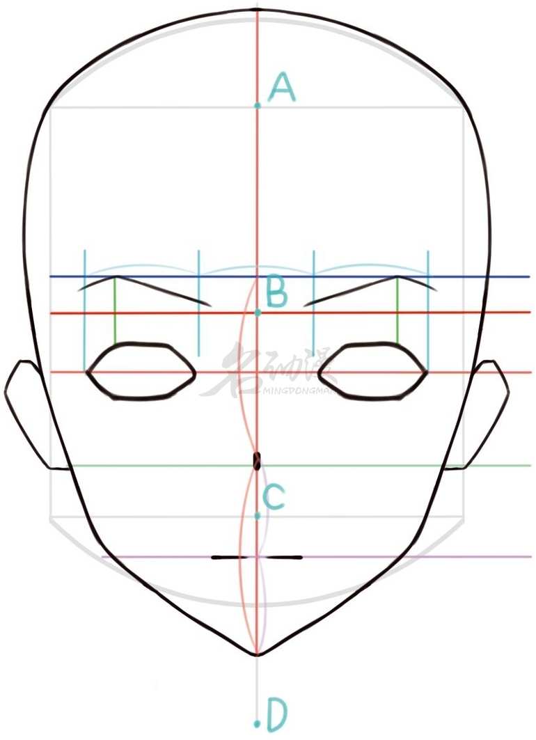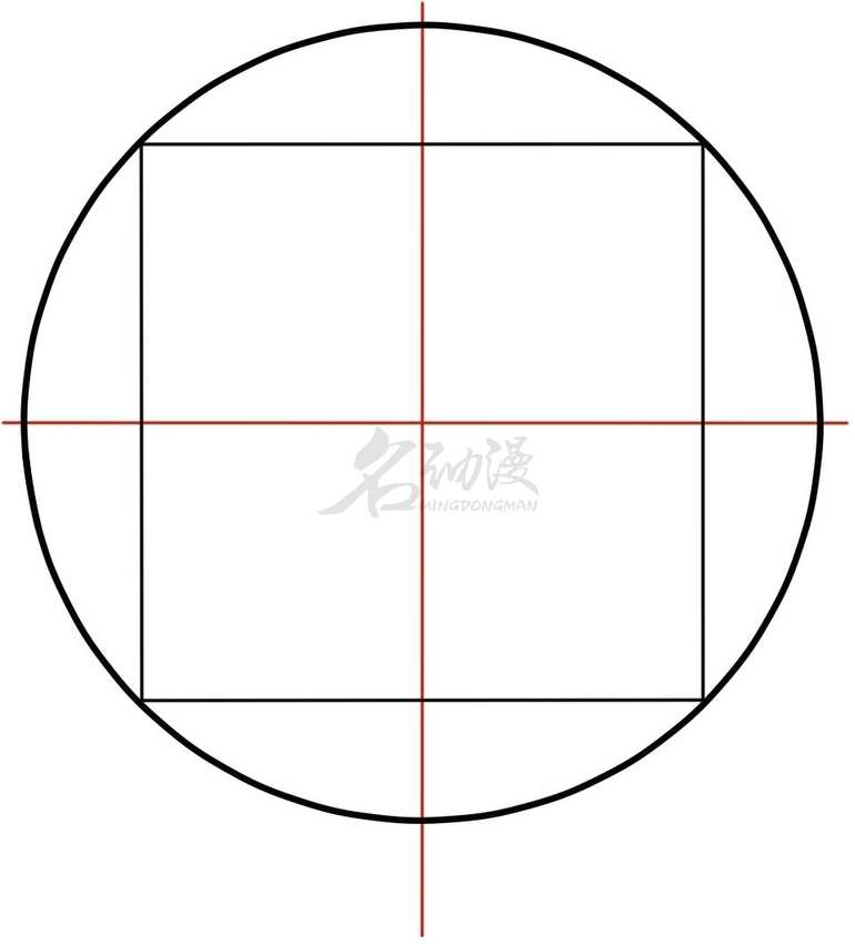 (1)先做出一个圆,概括出头部,然后画出内切正方形和十字线。