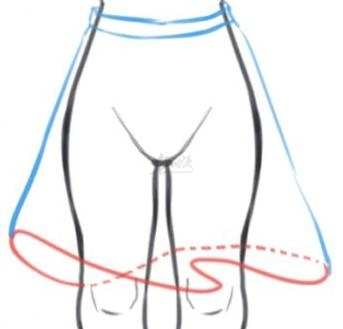 第二步:接着在腰部处刻画出裙子的裙口处(就人物的腰部位置),将腰两侧的与裙摆连接(蓝线)。特别注意在刻画裙口时,不能直接贴在腰部,因为裙子时有厚度的,所以要与腰部留一点缝隙,表示裙子的厚度感。如图所示: