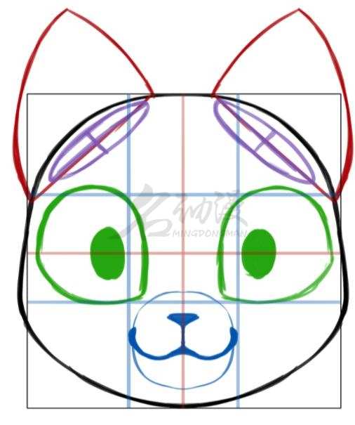 脸型的比例可以用一个 9 宫格网格来表示五官的位置,五官感官中的每个部位都占据着一个网格。例如用图下的脸型来说,眼睛的大小是要比其他五种感官大,鼻子和嘴巴在同一格子里。耳朵(或角)的范围占据左上角和右上角的网格。如果耳朵的位置不好找,可以用眼角的点来参考,以眼角点向上延伸为耳朵的位置。如图下所示: