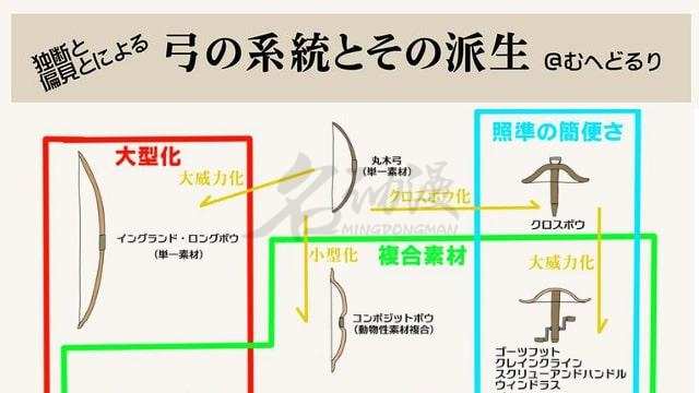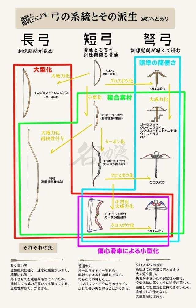 弓由有弹性的弓臂和有韧性的弓弦构成,杆为竹或木质(现代多为纯碳或铝合金),羽为雕,鹰或鹅的羽毛。弓又有牛角弓、复合弓和滑轮弓,而我们较为熟悉的、在日漫里经常看到的弓就做日本和弓,是合成弓。弓还有长弓、短弓和弩弓之分,这里有个画弓箭技巧,在设定角色武器时,可以根据人物性格或者时代背景设计出不同的弓箭类型,长弓适合远程攻击的角色,短弓适合灵活走位的角色,而弩弓则适合爆发力强的角色或者是偏现代背景的角色。