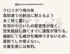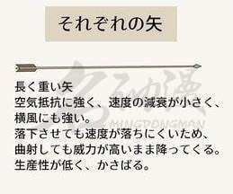 箭包括箭头、箭杆和箭羽。箭头为铜或铁制(现代的箭头多为合金),箭杆多用竹制,也有木制的,箭的飞行速度和准确性与尾羽的关系密切。箭羽太多,飞行速度慢;太少,稳定性差。不同的弓要结合不同的箭才能充分发挥出自身的实力,因此长弓用的箭,对空气阻力很强,箭飞出去的速度衰减程度也很小。短弓用的箭,是能直接射击和弯曲射击的全方位的箭。十字弓用的箭,通常又粗又短,变得很重,因此它射程更远、穿透力更大。画弓箭技巧:长弓配长箭,画弓箭时要时刻注意这点。
