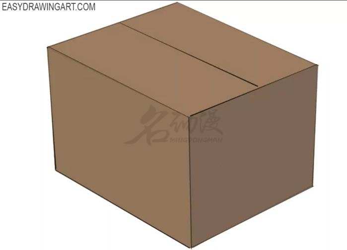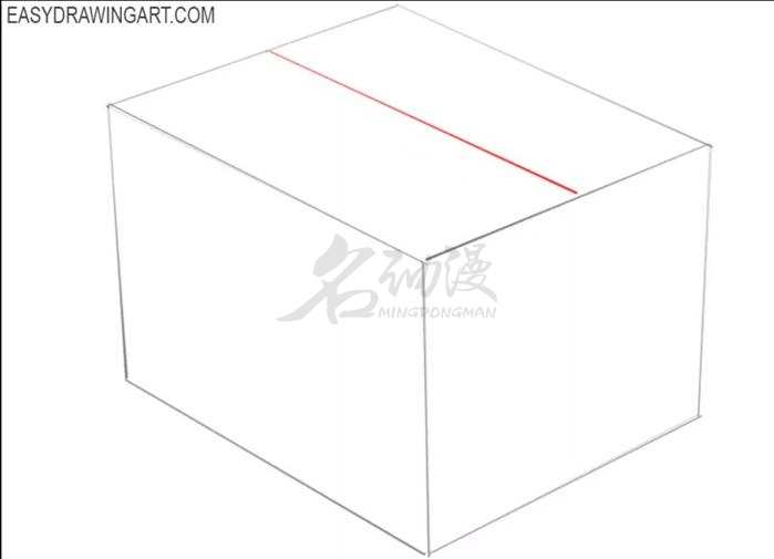 第二步:正方体画完后,其实已经将箱子的整体轮廓画出来了,只要我们增加一些细节就可以轻松将箱子的雏形画出来啦。比如,箱子是要装东西的,因此会在上方做一个活动口,所以我们将这活动口的线条画出来。红线代表的是箱子的封口,这样一画活灵活现的箱子就出来了。