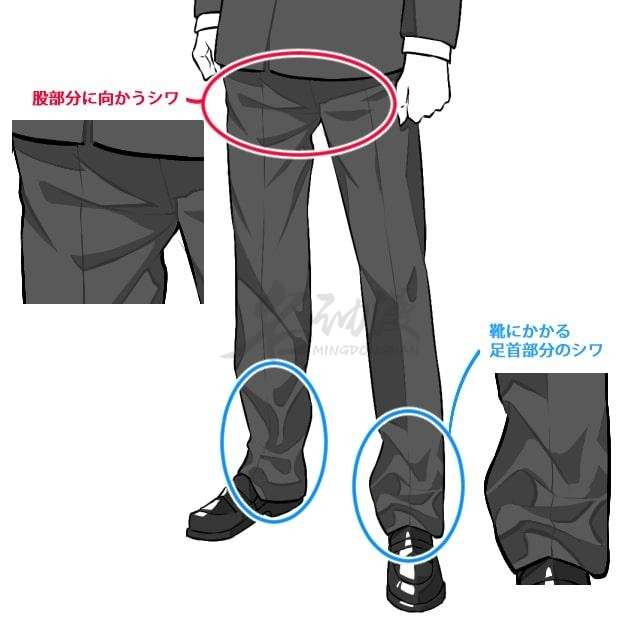 通常裆下、手肘、脚踝容易出现褶皱。而肩膀有衬垫,因为很硬把布料承托起来,所以不会皱。腰的束因为被上衣遮住,醒目的褶皱很难形成。注意过度的增加褶皱的线条数量的话会让制服看起来像丝绸面料一样薄,少了笔直感。画画时随着皱纹线的位置,阴影也画在胯下,胳膊肘,脚踝上,这样就能展现出褶皱的感觉。而脚踝的下摆会压到鞋子上,这里是特别容易产生褶皱的地方。