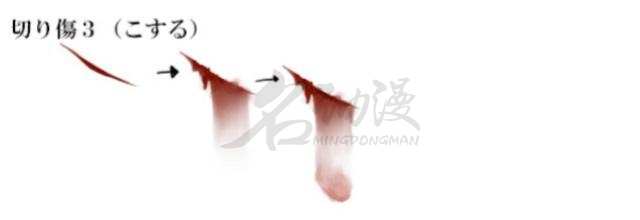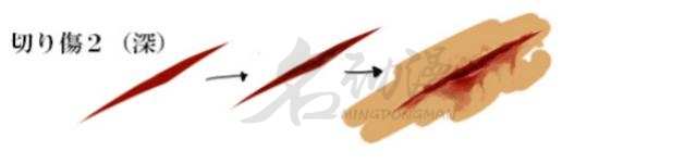 第二步:伤口深浅的表现手法并不一样,通常为了表现浅浅的划伤会画出血液从伤口流淌下来的效果,而较深伤口的画法则是将划痕画大一些,调低伤口较深部位的亮度。