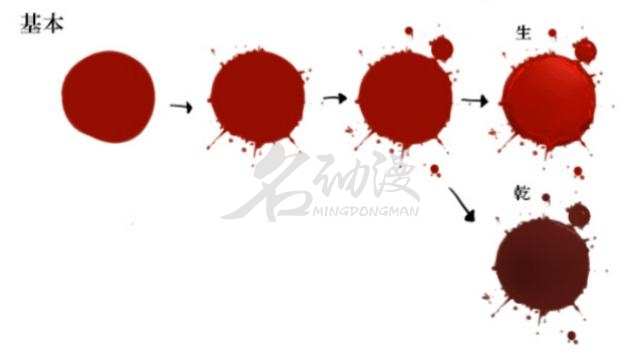 血液应该怎么画呢?如下图所示:滴落的血液呈圆形,四周溅起水花。画新鲜的液体血时,需要考虑光线照射的方向,在轮廓周围轻轻打高光。随后加入阴影,液体会因为表面张力而隆起的感觉,塑造出血液的体积和厚度。在画干掉的血时,颜色上则是像咖啡色一样红色,几乎没有高光和阴影。这里讲述到的方法可以应用到画伤口上,区分新鲜伤口与旧伤。