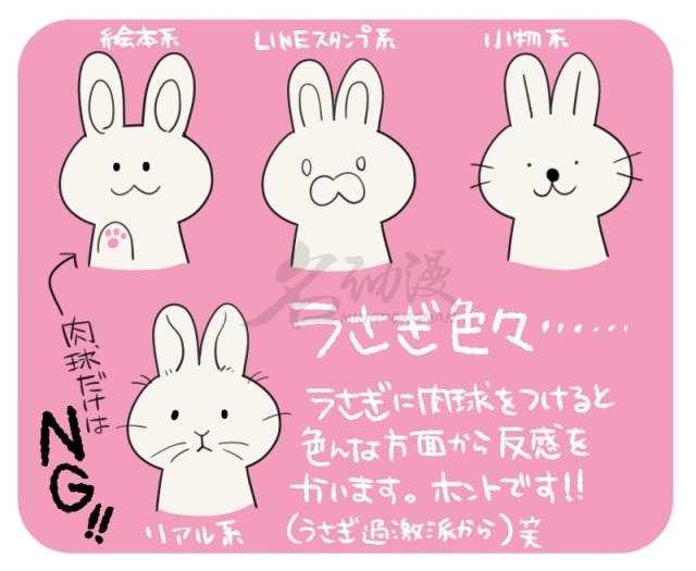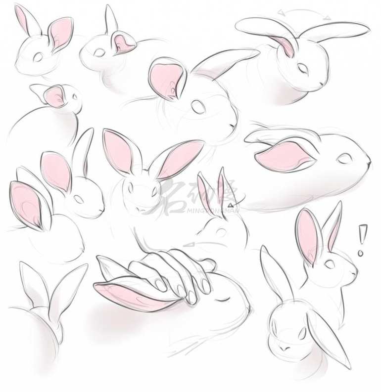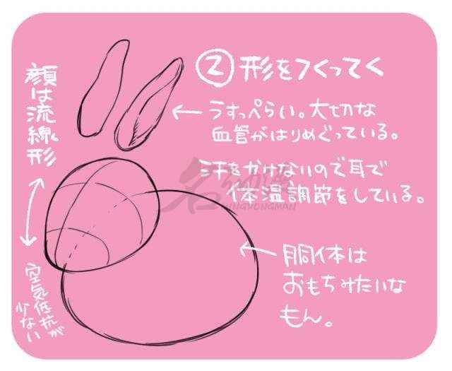 第二步:一只兔子为了减少空气阻力,它的脸是流线型的。而它细长的耳朵很薄,重要的血管都在耳朵内循环,还担负着调节体温的作用。耳朵和耳朵之间几乎没有缝隙。如果是兽人向的兔耳,可以参考上一期狐狸耳朵的画法,耳朵随着人的情绪波动有不同的变化,如下图所示:悲伤时耳朵向外扩,塑造出垂头丧气的感觉。